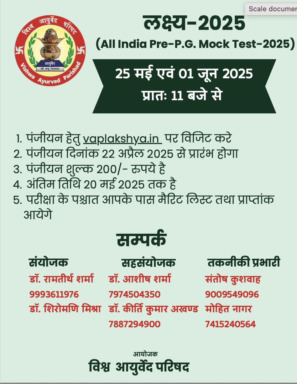 Date: 25-05-2025Lakshya (All India Pre-P.G. Mock Test)-2025 September 16, 2025September 16, 2025 Post navigation PREVIOUS PAGE Previous post: Date: 10-06-2025Personality Development Camp (With Practical Workshop & Hands on Training)-UdaipurNEXT PAGE Next post: Date: 31-05-20259th Ayurveda Kaushalam-2025