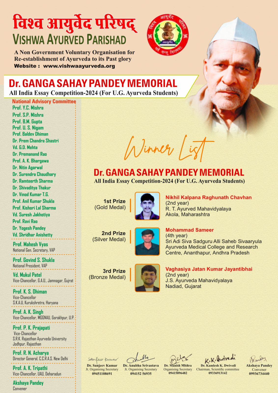 Dr. GANGA SAHAY PANDEY MEMORIAL All India Essay Competition-2024 (For U.G. Ayurveda Students) Results